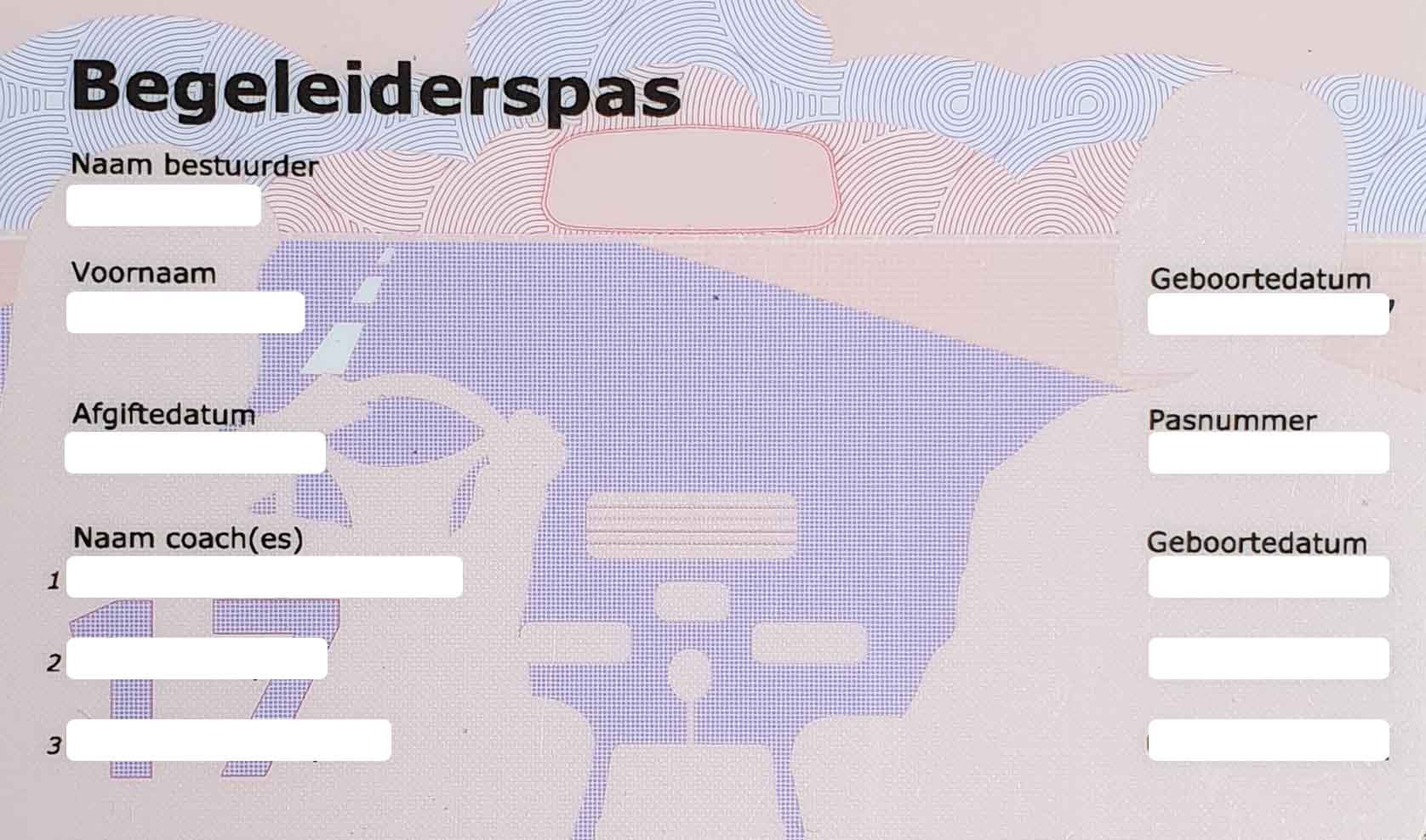 Om begeleid te mogen rijden, heb je naast je rijbewijs ook een begeleiderspas nodig. Op deze pas staan de gegevens van jouw begeleiders vermeld. Zonder deze pas mag je niet de weg op, ook al heb je een rijbewijs.